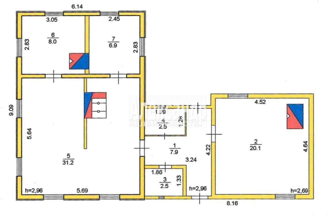 комнаты 20 + 8 + 6.9 кв.м., высокие потолки (3 метра) и большие окна ПВХ, пропускающие много естественного света.